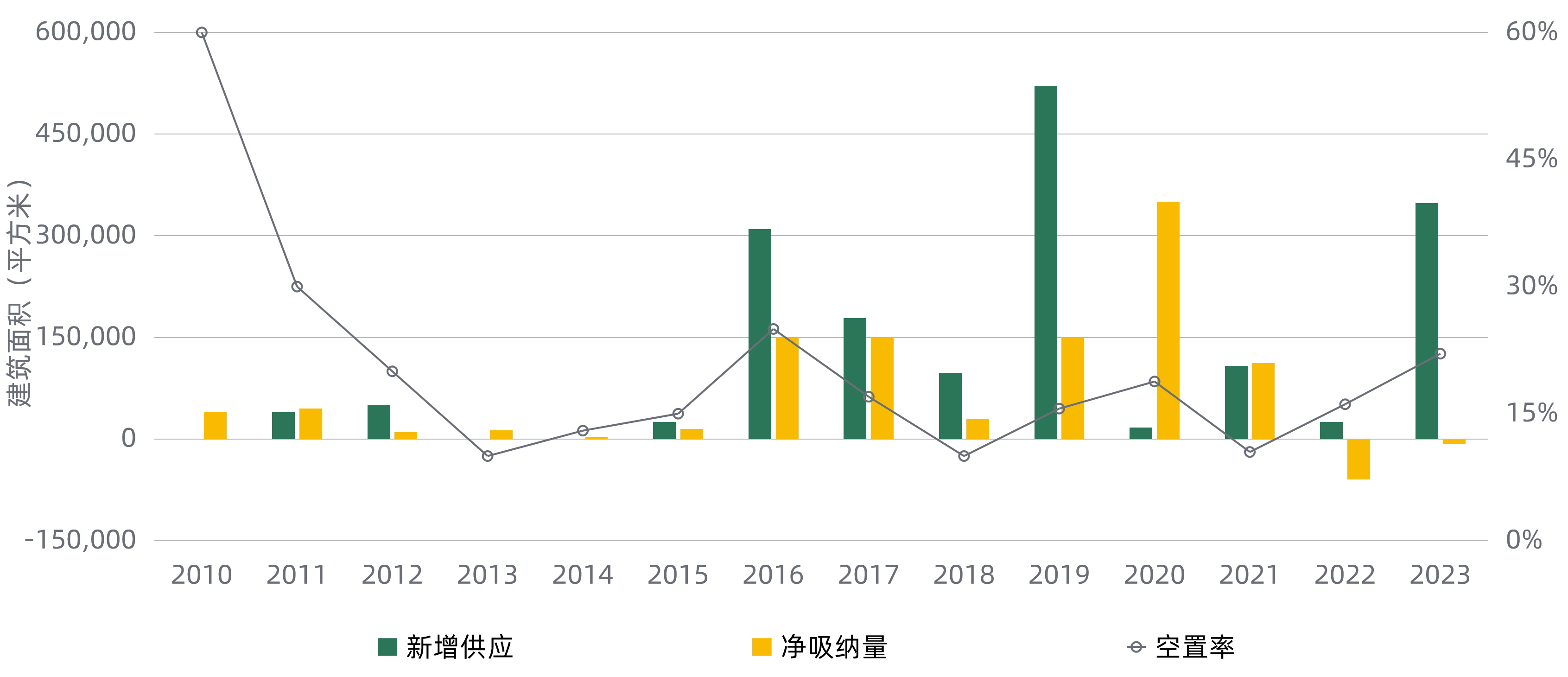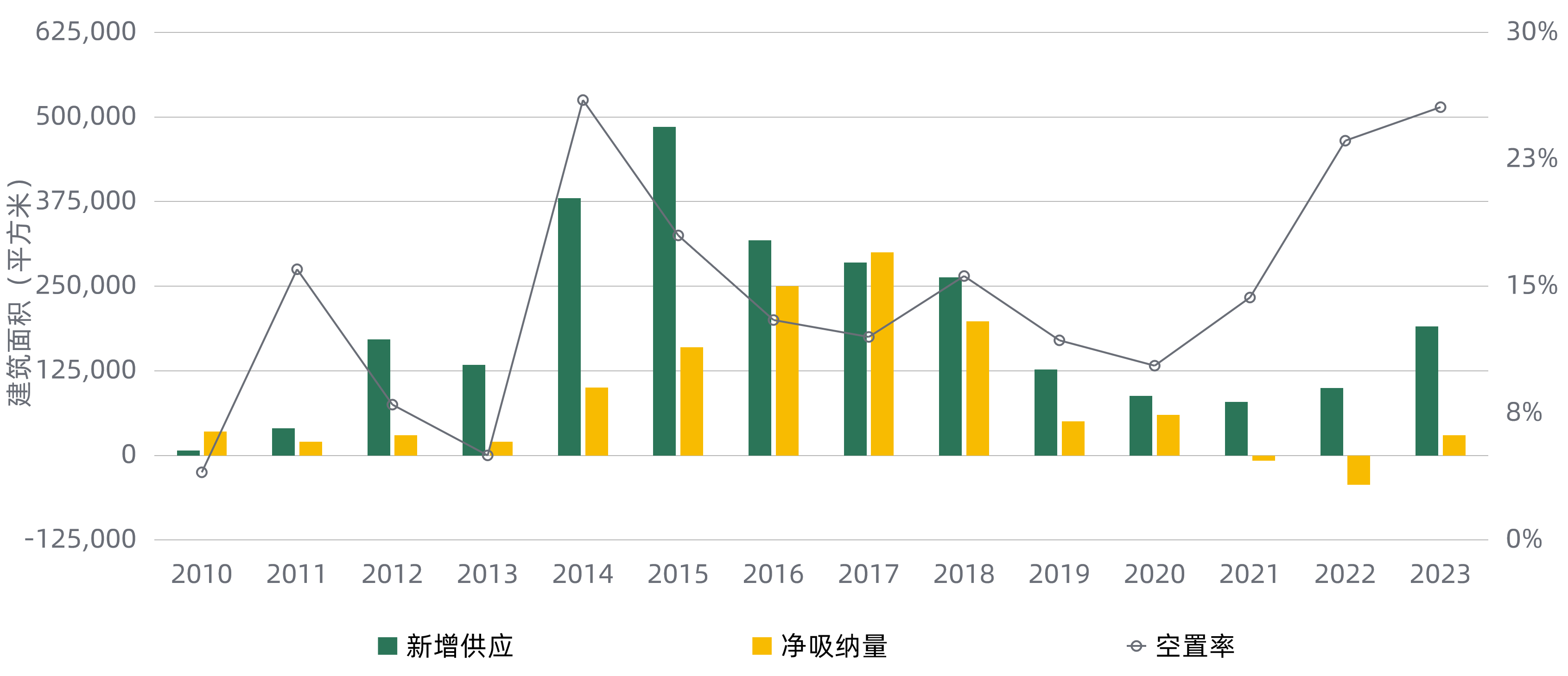 亞奧商圈甲級(含頂級)寫字樓凈吸納量有所回升,但仍舊處于負值;空置率受部分項目面積釋放影響,繼續(xù)呈上升態(tài)勢。甲級(含頂級)及乙級寫字樓成交租金整體均有所降低;本季度該商圈乙級寫字樓去化更為明顯,乙級空置率有所降低。預測下半年將陸續(xù)有新的甲級寫字樓及城市更新項目入市,該商圈整體空置壓力將進一步增加,同時也會為本商圈及相鄰商圈的租戶帶來更多選擇。