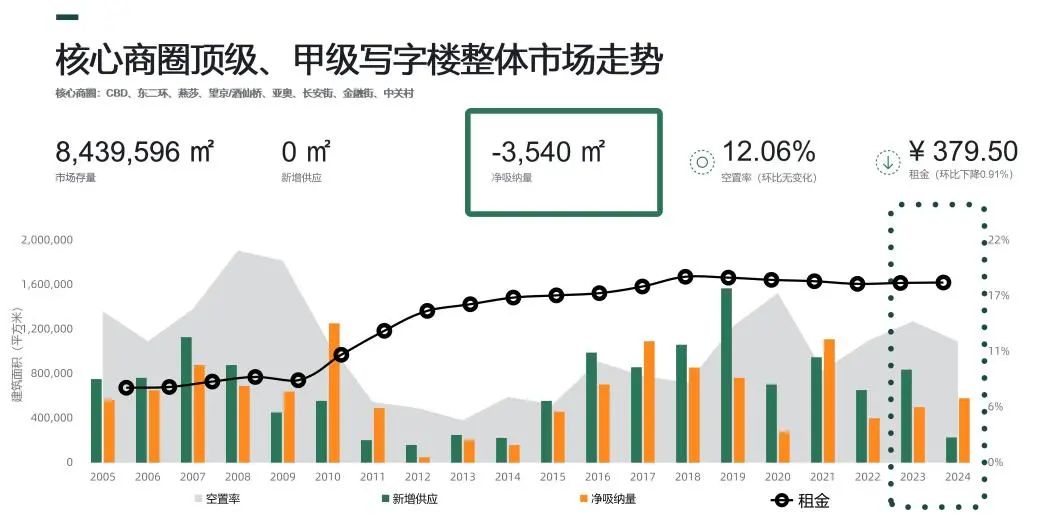 北京整體寫字樓租賃市場所受新冠肺炎疫情的影響為爆發之初以來最大,且部分租戶退租、科技企業優化,加之需求呈現疲軟態勢,全市整體凈吸納量為-35,885平方米,是自2020年第一季度以來首次轉負,市場活躍度進一步降低。