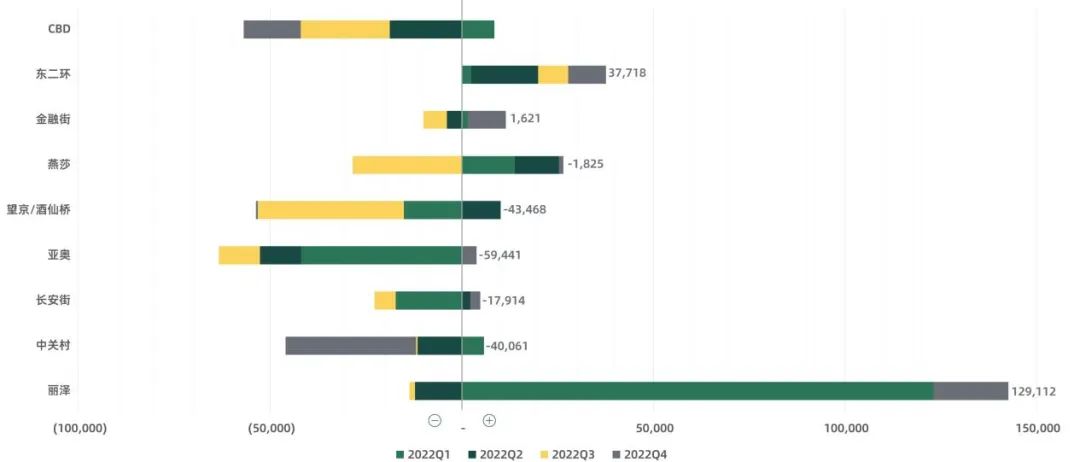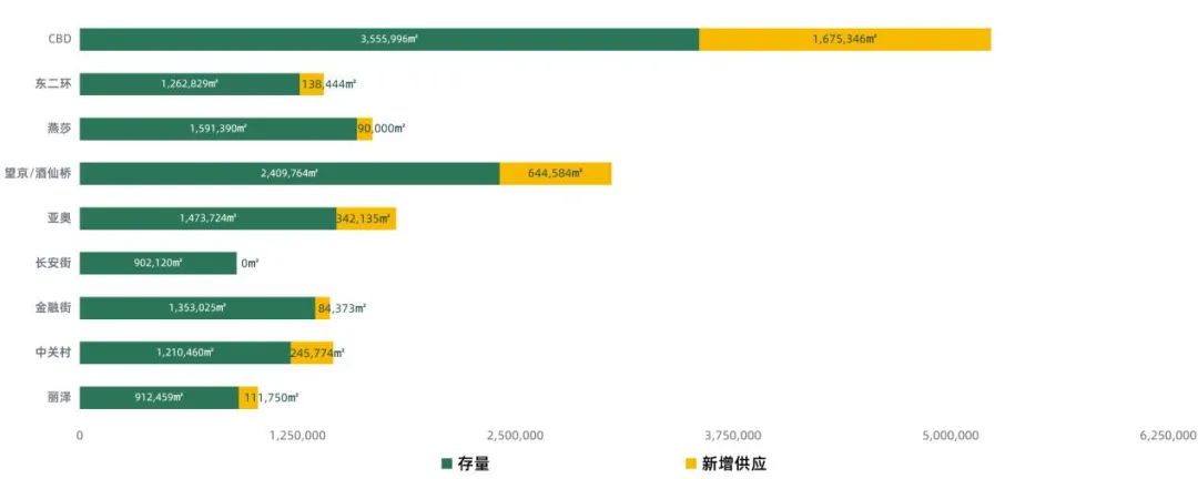 2022年第四季度全市整體存量有所增加,連續(xù)兩個(gè)季度無新增供應(yīng)量之后,本季度迎來2個(gè)甲級(jí)寫字樓項(xiàng)目入市,分別為長(zhǎng)安街商圈的王府77項(xiàng)目,以及通州商圈的新光大中心A5項(xiàng)目。兩個(gè)新項(xiàng)目的入市共為市場(chǎng)帶來約120,900平方米的新增供應(yīng)量。