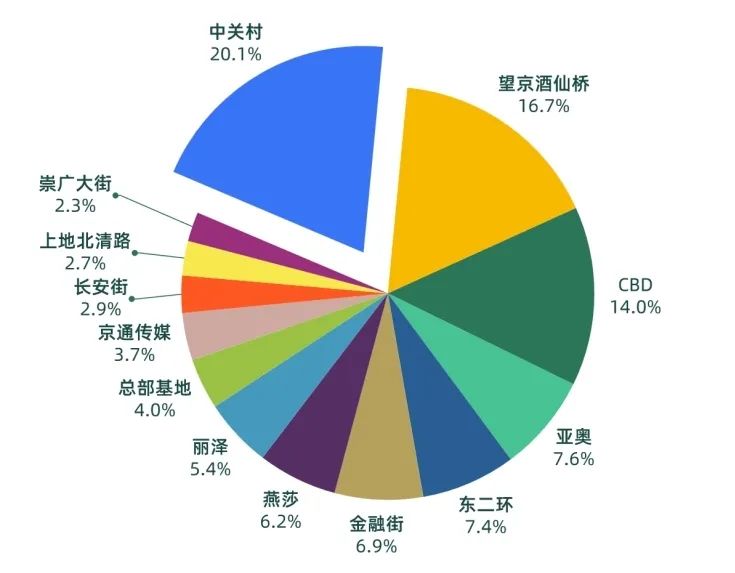 2022年第四季度科技行業(yè)在中關(guān)村、望京酒仙橋商圈成交面積占比顯著,占比超過全市的五成,亞奧、燕莎等商圈也有該類企業(yè)落位。