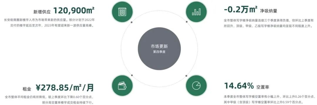 2022年第四季度全市整體寫字樓市場(chǎng)需求量有所回暖,但受疫情的持續(xù)影響,全市整體市場(chǎng)活躍度成交量依然錄得負(fù)值,全市整體寫字樓凈吸納量為-2,929平方米,其中甲級(jí)(含頂級(jí))寫字樓凈吸納量為-15,377平方米,乙級(jí)寫字樓凈吸納量為12,448平方米,但全市整體寫字樓凈吸納量環(huán)比上季度上升69,800平方米。