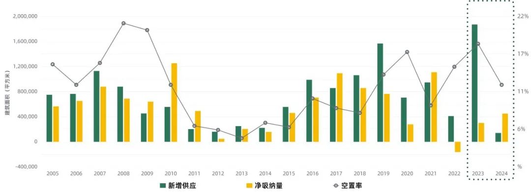 2022年寫字樓租賃市場(chǎng)受疫情影響,本年度市場(chǎng)活躍度持續(xù)呈現(xiàn)走低態(tài)勢(shì),2022年計(jì)劃入市的部分寫字樓項(xiàng)目延期交付,致使2022年第二、第三季度市場(chǎng)無新增供應(yīng)量,為2015年以來同期新增供應(yīng)量的最低值。