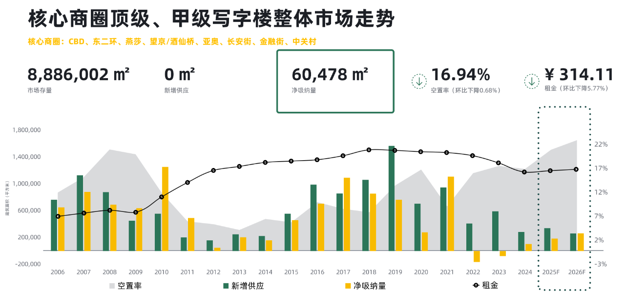 2024年全年投入市場的新增供應量超過了120萬平方米,其中甲級寫字樓超過30萬平方米;部分開發商保持觀望態勢,將原計劃于年內入市的新項目延后至2025年交付。