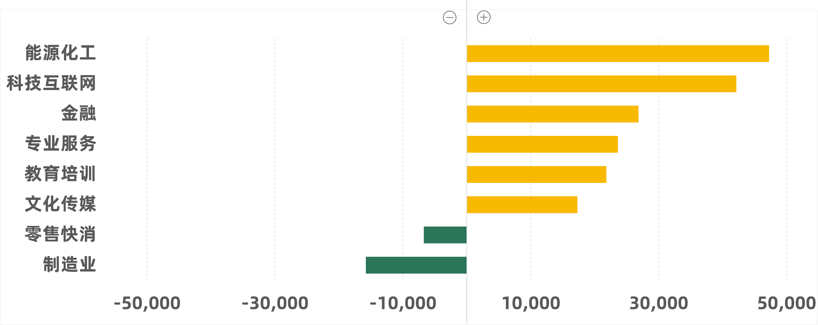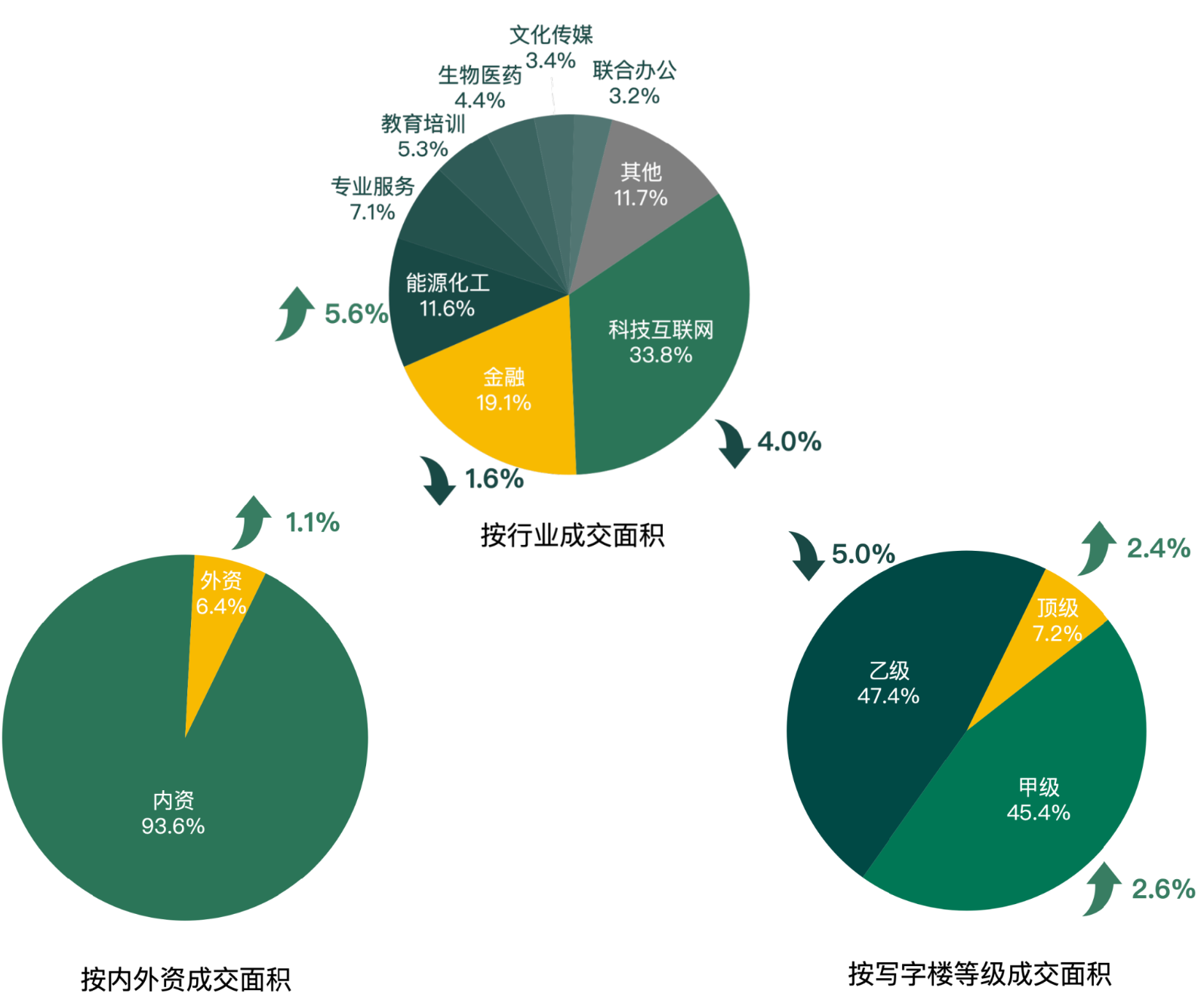 從行業成交面積來看,能源化工、科技互聯網行業環比上季度成交面積上升均超過3萬平方米;金融、專業服務、教育培訓、文化傳媒行業成交面積亦有所增長。零售快消及制造業成交面積占比降低。