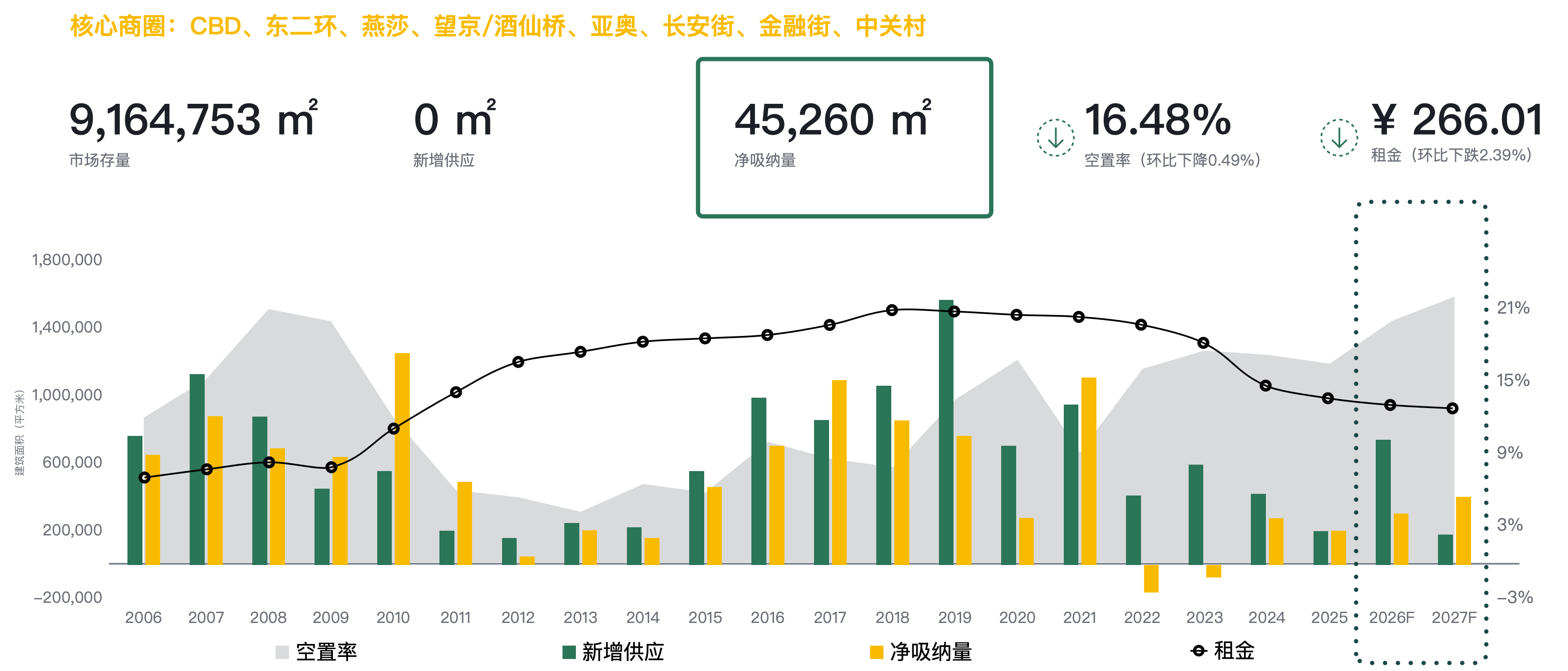 本季度核心商圈甲級(jí)(含頂級(jí))寫字樓凈吸納量為45,260平方米,空置率環(huán)比下降0.49個(gè)百分點(diǎn),錄得16.48%;成交租金延續(xù)下行,環(huán)比上季度下跌2.39個(gè)百分點(diǎn),為每月每平方米266.01元。